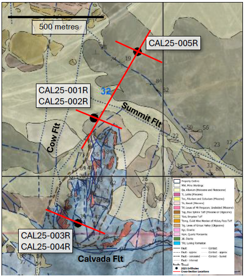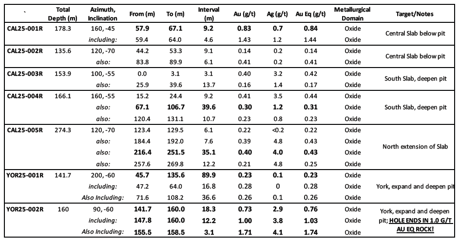 • Slab: 39.6 metres (67.1 – 106.7m) grading 0.30 g/t Au immediately below the south end of the Slab open pit (CAL25-004R). This drill hole defines a second, strataform, oxide gold horizon that mimics the geometry of the Slab mineral resource defined by prior drilling* and confirms a new target for gold resource expansion.
