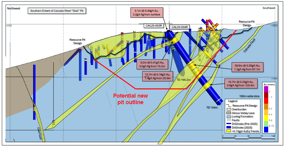 CAL25-004R cut 39.6 metres grading 0.30 g/t Au and 1.2 g/t Ag (0.31 g/t Au Eq, see table below), all oxide, and directly below gold mineralization seen in the Slab open pit and defined by historic drilling (see section below), providing an excellent opportunity to expand the conceptual pit shell at Slab. Additional drilling along strike and northwest of CAL25-004R (left in section) can add to potential gold resources at Slab and improve future project economics.