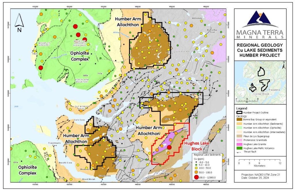 TORONTO, ON / ACCESS Newswire / May 15, 2025 / Magna Terra Minerals Inc. (the “Company” or “Magna Terra“) (TSXV:MTT) is pleased to announce exploration plans for 2025 on the 40,675-hectare, 100% owned Humber Copper-Cobalt Project (the “Humber Project” or the “Project”) located in western Newfoundland (Figure 1). Exploration will comprise systematic, property-wide airborne magnetic and electromagnetic surveying (2,250 line kms), geochemical sampling, prospecting, and geological mapping with a focus on identifying the source of anomalous copper (Cu), cobalt (Co), lead (Pb), silver (Ag), molybdenum (Mo), gold (Au), arsenic (As), and antimony (Sb) lake sediment values (Figures 1 and 2).