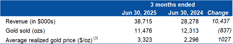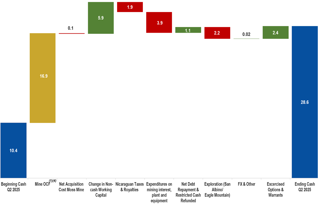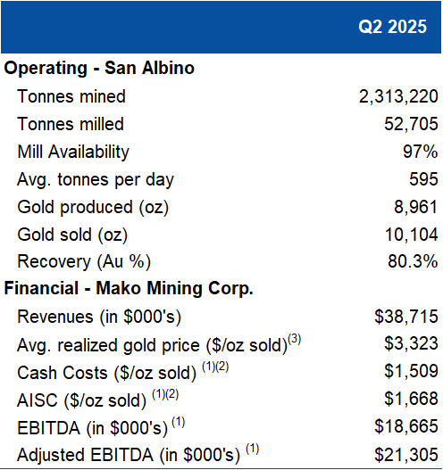 The Company’s financial results for Q2 2025 reflect record gold sales from its San Albino and Moss Mine of $38.7 million (vs. $28.3 million in Q2 2024), which generated $16.9 million in Mine Operating Cash Flow (1) (4), $21.3 million in Adjusted EBITDA(1), and $8.8 million in Net Income. The Company sold 11,476 oz of gold at an average price of $3,323/oz with a $1,509 Cash Cost and $1,668 All-In Sustaining Cost (“AISC“) ($/oz sold). (1) (2)