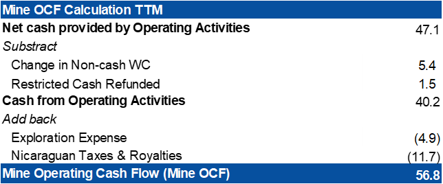 “Mine OCF” represents operating cash flow, excluding Nicaraguan taxes and royalties, changes in non-cash working capital and exploration expense