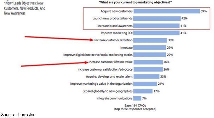 Losing Sight of ObjectiveSure, launching a new product/service is fun and so is increasing brand awareness … it’s numbers you can show the boss.  It may not be glamorous, but most of marketing’s attention should be on keeping customers and keeping them longer.