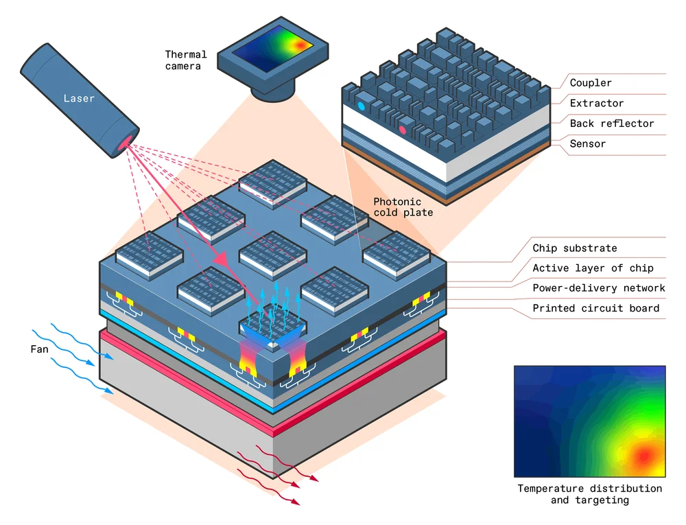 Core Components: Photonic cold plates integrate couplers, extractors, back reflectors, and thermal sensors to detect and target hotspots with laser precision.