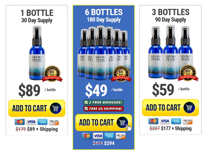 NeuroPulse is available in multiple pricing tiers to accommodate different user needs. A single bottle is priced at $89, while a three-bottle package offers a discounted rate of $59 per bottle, totaling $177. For those committed to long-term use, the six-bottle package is available for $49 per bottle, totaling $294, and includes free shipping. Additionally, users who purchase six bottles receive three valuable bonuses at no extra cost, enhancing the overall value of their investment.