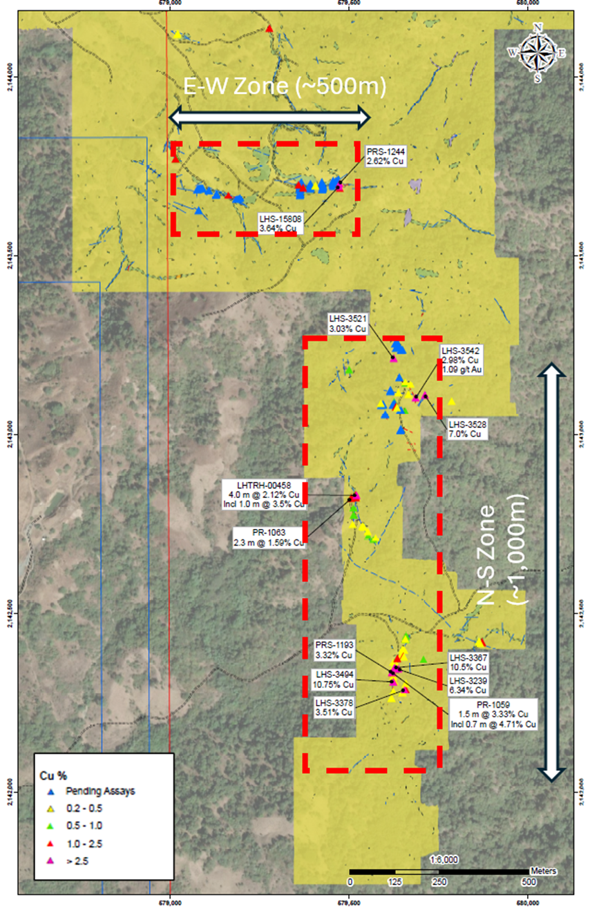 We currently see two broad trends at La Huerta South (see Figure 1). One has an expression that has so far been defined by a N-S strike of ~1,000 metres. This has yielded standout results through samples such as 7.0% Cu at sample LHS-3528, 10.8% Cu at LHS-3494, and 10.5% Cu at LHS-3367, with numerous other showings above 2.0% Cu. Copper mineralization is hosted in chalcopyrite and bornite.