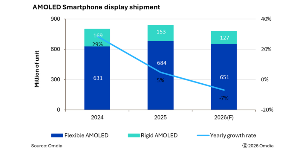 These dynamics are expected to have a direct impact on the smartphone display market. Omdia forecasts that AMOLED smartphone display shipments in 2026 will fall to 778 million units in 2026, a 7% year-on-year decline. The flexible AMOLED segment is projected to decline for the first time in seven years while rigid AMOLED shipments are expected to contract for a second consecutive year, driven by accelerated migration toward Flexible AMOLED displays.