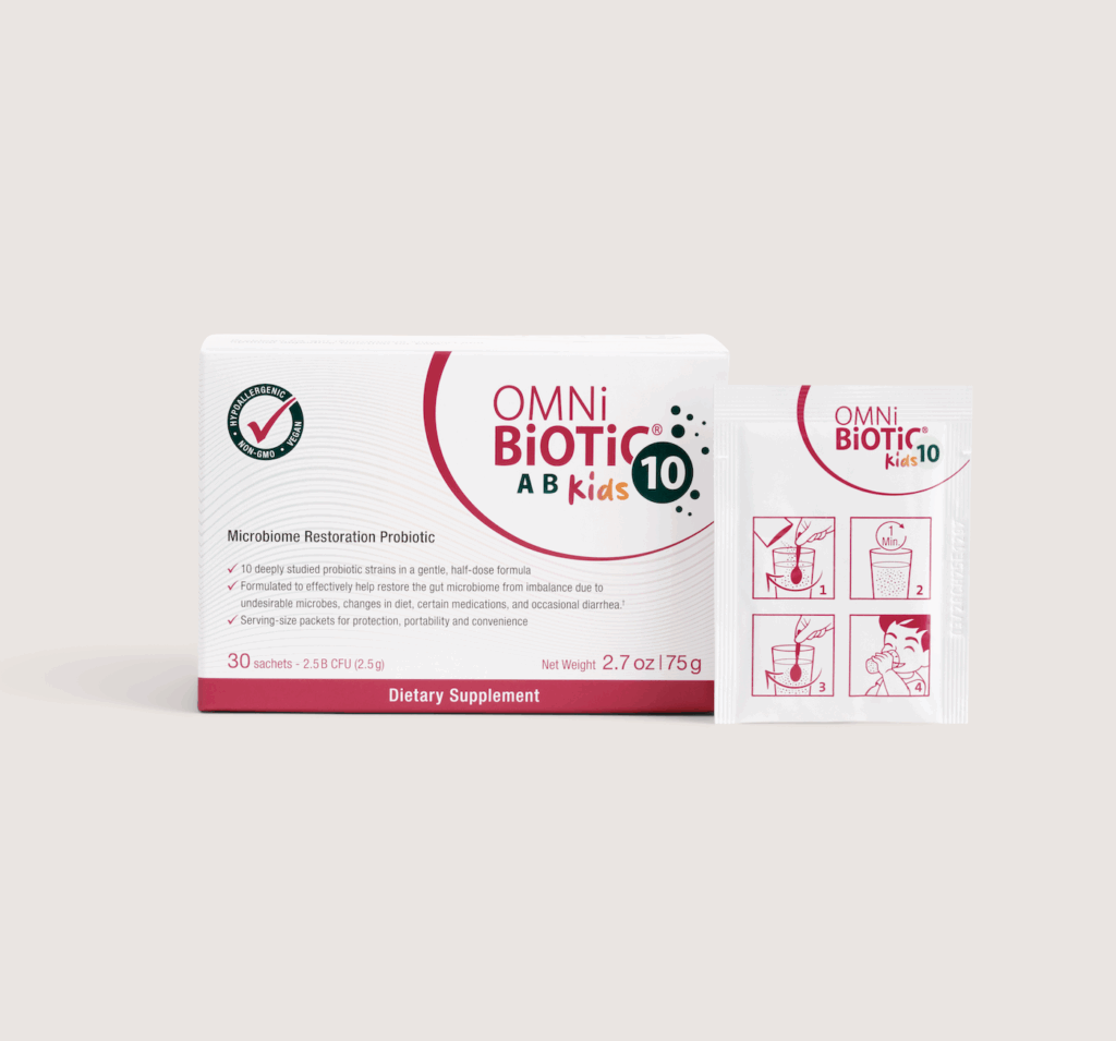 Building on the success of Omni-Biotic AB 10, trusted worldwide for restoring gut balance, AB 10 Kids delivers the same 10 clinically studied probiotic strains in a gentle half-dose powder. Flavorless and easy to mix into water, milk, or yogurt, AB 10 Kids supports gut flora diversity, especially during and after antibiotic use, and can be taken daily to maintain digestion and immunity. Omni-Biotic’s powder delivery ensures an 83% probiotic survival rate into the gut, compared to an average of just 7% in leading U.S. capsule brands.*