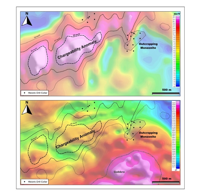 Figure 2: Top. Chargeability from 2011 IP Survey. Bottom. RTP TMI magnetic image overlain with chargeability contours. Both images display outline of mapped monzonite outcrops and historical drill collars on the peripheries of the chargeability highs.