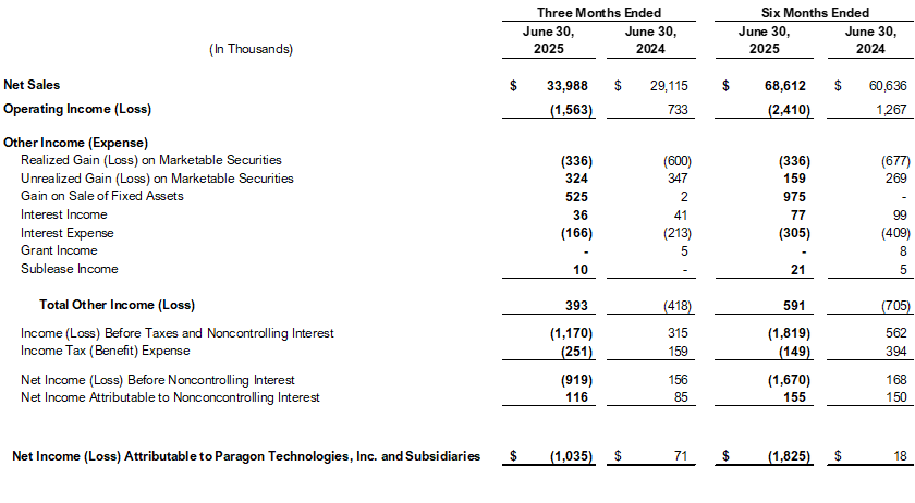 Paragon Technologies, Inc.’s Consolidated Statement of Operations for the three and six months ended June 30, 2025, and 2024 are summarized below. For further details on our results, shareholders should carefully review our quarterly report, which can be found at www.pgntgroup.com.