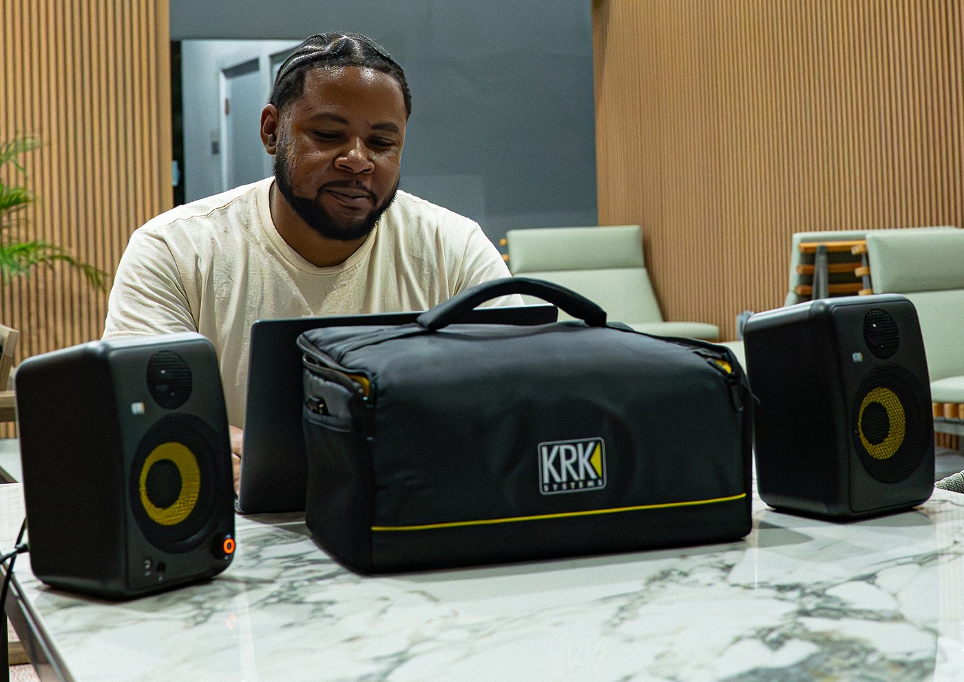 From impromptu beat-making sessions to vibing out with mixes, Johhny G appreciates the flexibility and uncompromised audio quality that KRK brings to his creative workflow. “I use the GoAux mainly for home mixing sessions,” he explains. “I will set the monitors up and make beats from anywhere — the kitchen, balcony, you name it.”