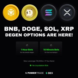 Kingstown, Saint Vincent and the Grenadines–(Newsfile Corp. – June 26, 2025) – PowerTrade, the leading altcoin options exchange, has officially expanded its ultra-short-dated option offerings to include four major altcoins: BNB, DOGE, SOL and XRP. Traders can now access 10-minute and 1-hour expiries across these markets with zero fees, no liquidations, and over 10,000× effective leverage—on both the centralized PowerTrade platform and decentralized PowerDEX available on Base, Ethereum and Solana.