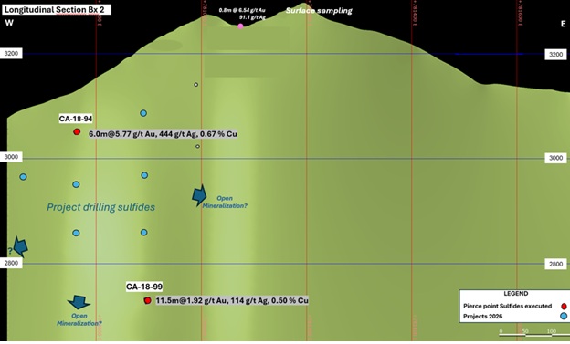 The company plans to submit its surface exploration permit for Portachuelos via the FTA (Ficha Tecnica Ambiental) process in June 2026. The target at Portachuelos will be the BX2 structure that was last drilled in 2018. BX2 only has two drill intercepts to date. Both intercepts show high grade mineralisation with CA-18-94 of 6.0 m, 5.77 g/t Au. 444, g/t Ag, and 0.67% Cu and CA-18-99 with 11.5 m of 1.92 g/t Au, 114 g/t Ag and 0.50% Cu. The intercepts are separated by approximately 300 meters. Upon the completion of the drill program the Company will be in a position to determine an internal resource of the BX2 vein. The Portachuelos drilling will be supported with downhole EM surveys to characterise the response of the different Portachuelos structures to this geophysical method.