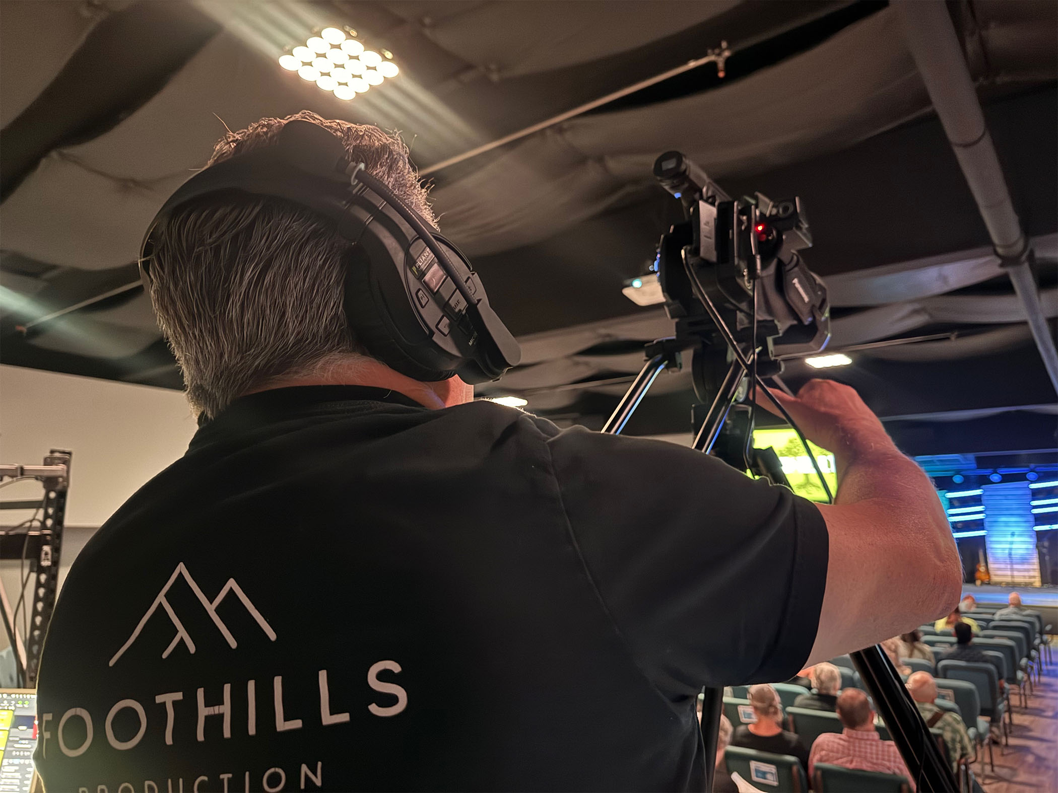 Foothills Community Church needed a compact but capable wireless communication system that could support a small, distributed production team. The MicroCom XR system connects camera operators, the lighting technician, video director, and graphics operator, all across a 125-foot distance from the auditorium, separated by the church lobby and walls. “They are very happy with the system,” says Hamilton.