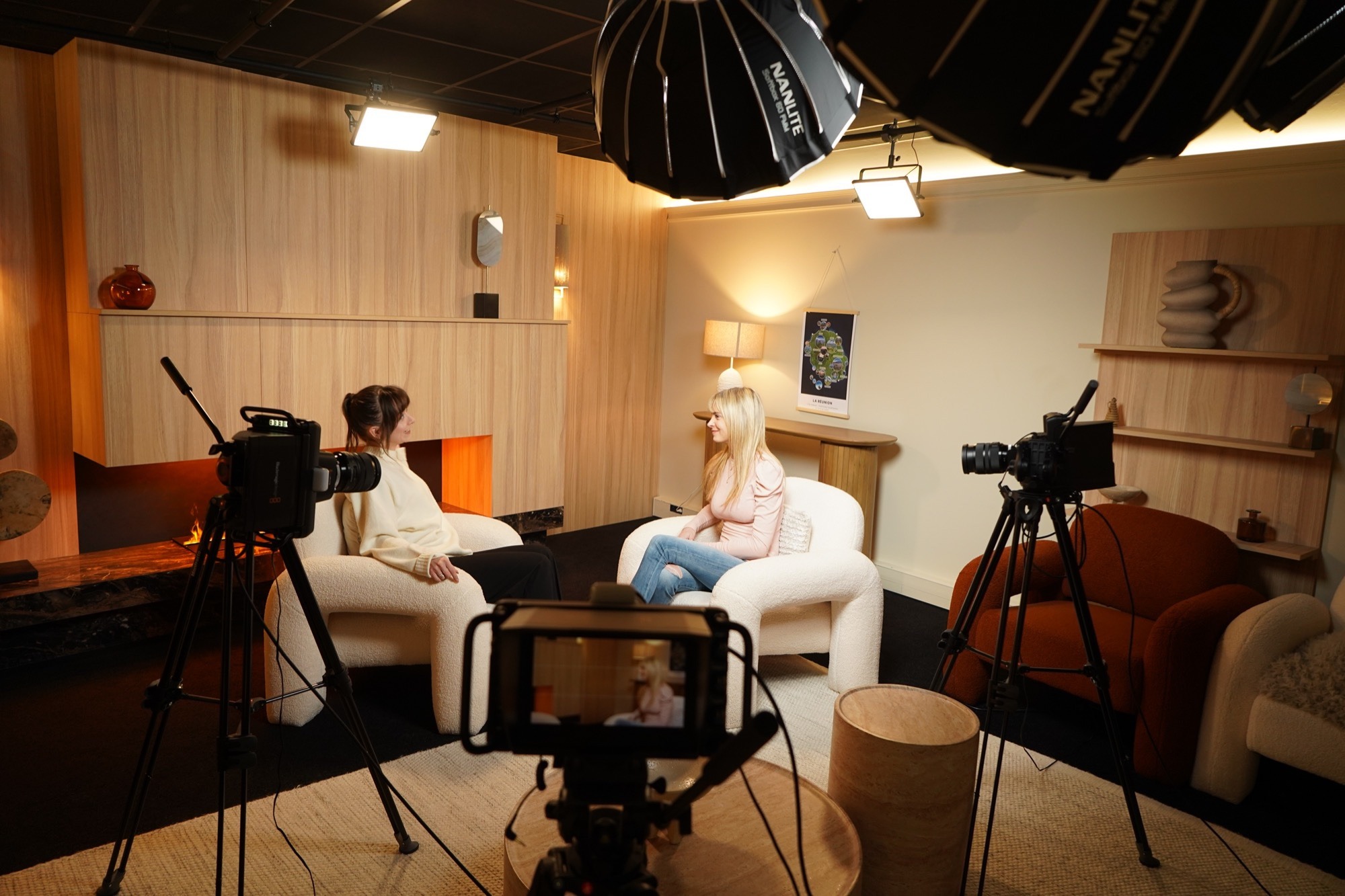 Recordia currently uses 20 Blackmagic Studio Camera 4K Pro G2s across four distinct studio environments. The two smallest spaces use four cameras each, enough for individual coverage plus a master shot. A third space, nicknamed the “Cozy Cream” for its fireplace and armchair aesthetic, runs five cameras while the largest studio accommodates up to ten people with seven camera positions.