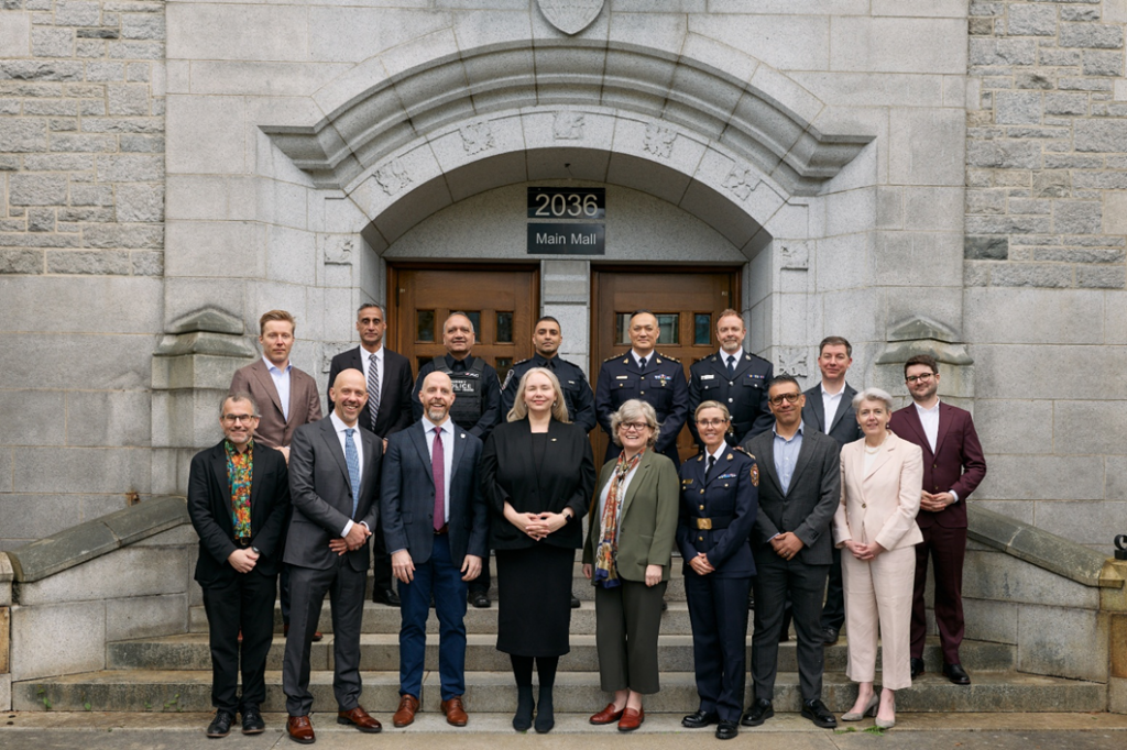 Figure 1 – Front row, left to right: Mark MacLachlan, Dean, Faculty of Science UBC; Dr. Matthew A. Roberts, Managing Director, Aidos; Dr. Benoit-Antoine Bacon, President and Vice-Chancellor, UBC; Nina Krieger, Minister of Public Safety and Solicitor General of British Columbia; Josie Osborne, Minister of Health for British Columbia; Fiona Wilson, Chief Constable, Victoria Police Department; and Dr. Pouya Azar, Director, Aidos.