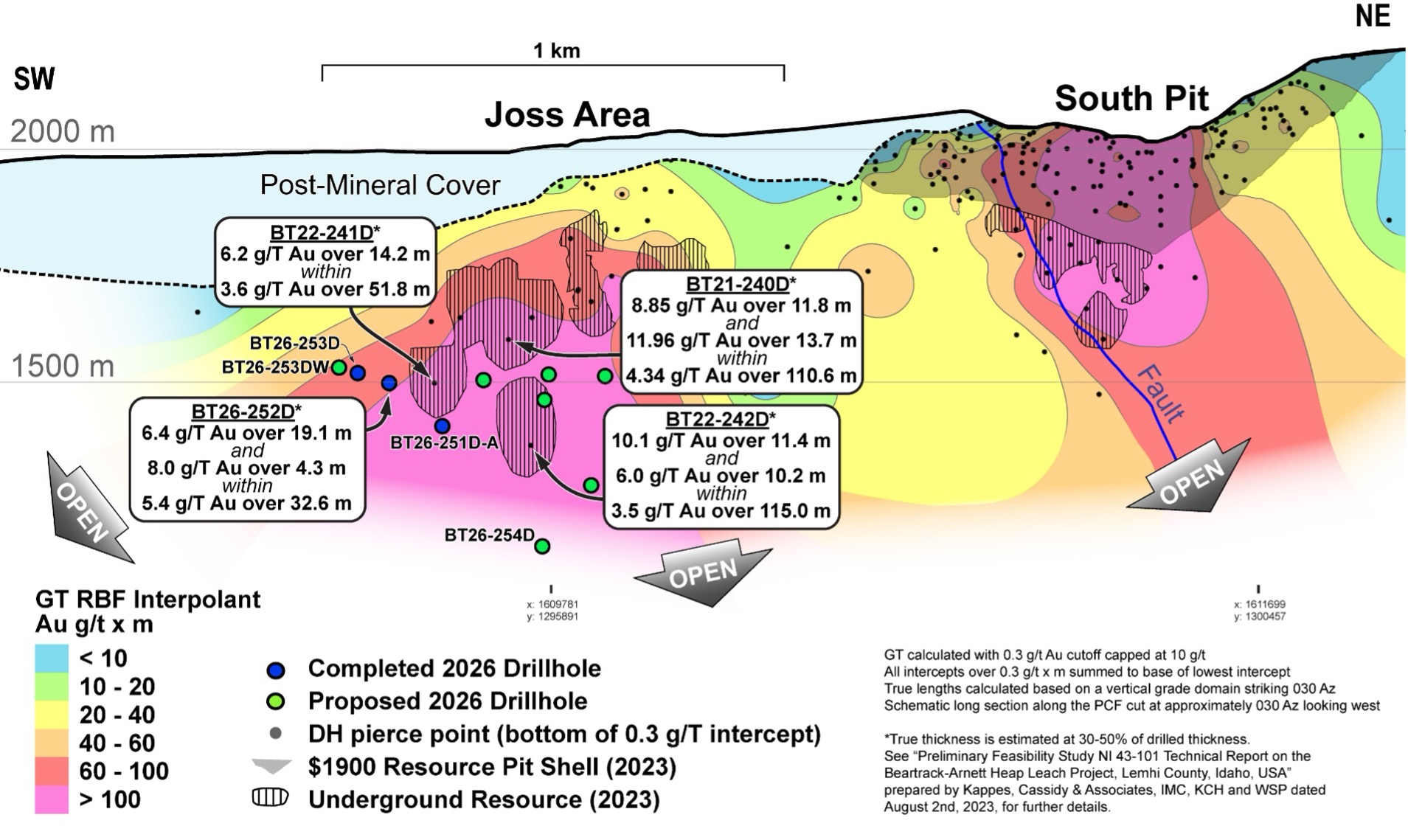 The Beartrack-Arnett gold project is a structurally controlled orogenic gold deposit running north-south on the Panther Creek Shear Zone (“PCSZ”). In the Joss area, the project hosts an underground Inferred Mineral Resource of 6,745,000 tonnes grading 4.05 grams gold per tonne for 877,000 ounces of gold that is not included in the 2023 first phase open pit, heap leach PFS economics (see “Preliminary Feasibility Study NI 43-101 Technical Report on the Beartrack-Arnett Heap Leach Project, Lemhi County, Idaho, USA” prepared by Kappes, Cassidy & Associates, IMC, KCH and WSP dated August 2nd, 2023, for further details).
