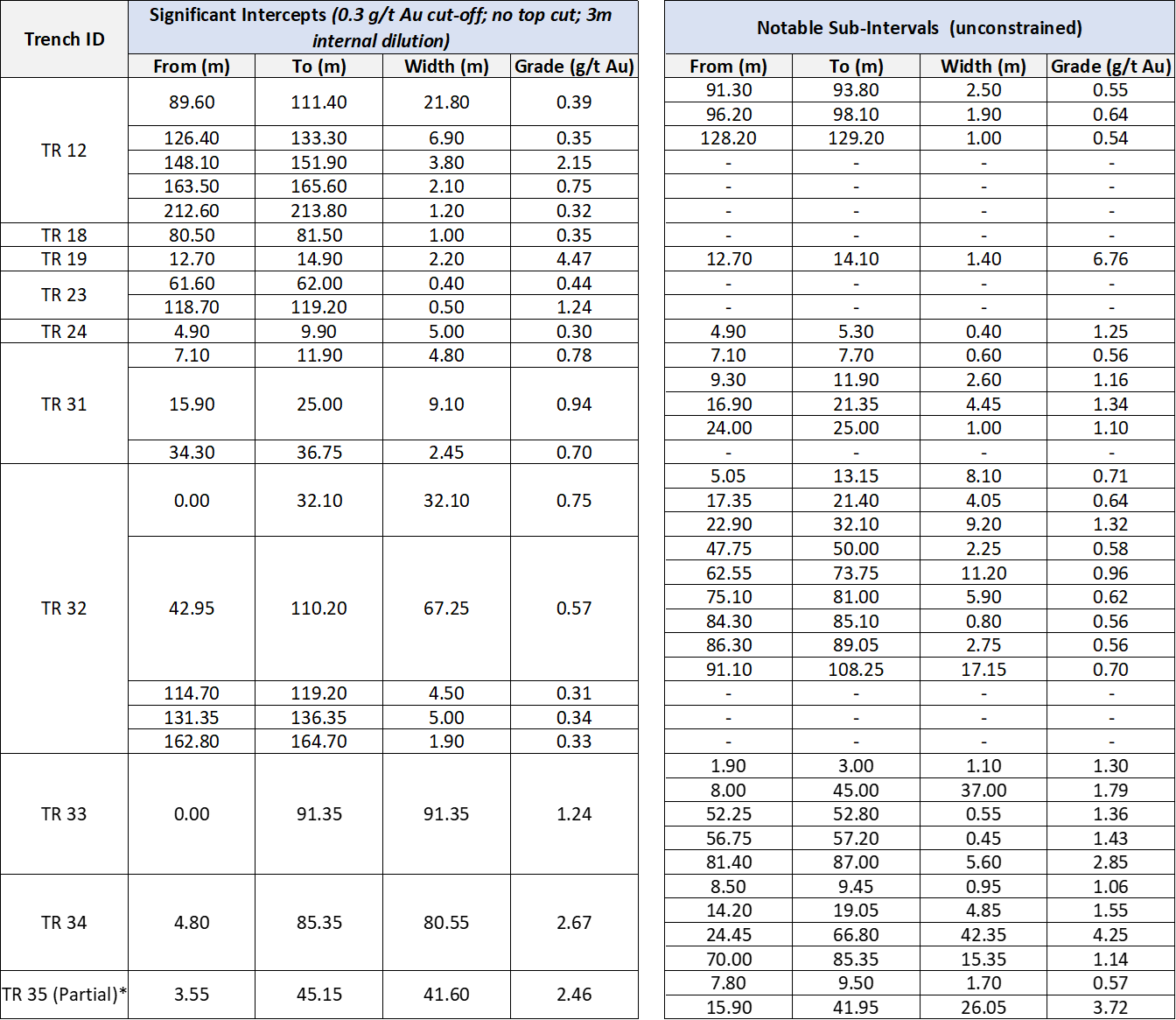 TR35*: 41.60m @ 2.46 g/t Au; including 26.05m @ 3.72 g/t Au (partial results)