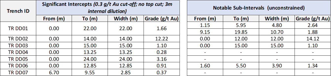 Refer to Appendix B for a summary of significant trench Intercepts (>1.0 g/t Au; 1.0m Internal Dilution) and internal high-grade over-limit sample distribution and gram meter values.