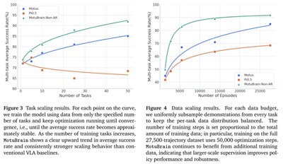 Motbrain learns from a far broader range of data than conventional AI models that train robots, including unlabelled video, task recordings without language annotations, and data from different robot embodiments. A proprietary latent action framework extracts physical motion directly from large-scale video, including human footage, simulation data, and multi-robot task trajectories, without requiring the data to be labelled or tagged to indicate specific actions. This broader learning paradigm translates into strong scaling behavior. In task-scaling evaluations, Motubrain’s average success rate continued to rise as the number of training tasks increased, reaching approximately 92% at 50 tasks, while Pi-0.5 declined to roughly 68% over the same range. In data-scaling evaluations, Motubrain also maintained a clear advantage as the number of training episodes increased, achieving about 92% average success at 27,500 episodes, compared with roughly 85% for Motus and 68% for Pi-0.5. A three-stage pipeline built on a six-layer data pyramid lets Motubrain generalise skills across environments and robot types while remaining precise enough for fine-grained deployment scenarios.
