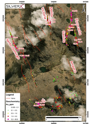 Figure 2. Surface gold geochemistry across the central Pampas vein cluster, highlighting high-grade values along the Santo Domingo, Victoria, Melita, Gaviota, Piscococha, Luz and Amparo structures.