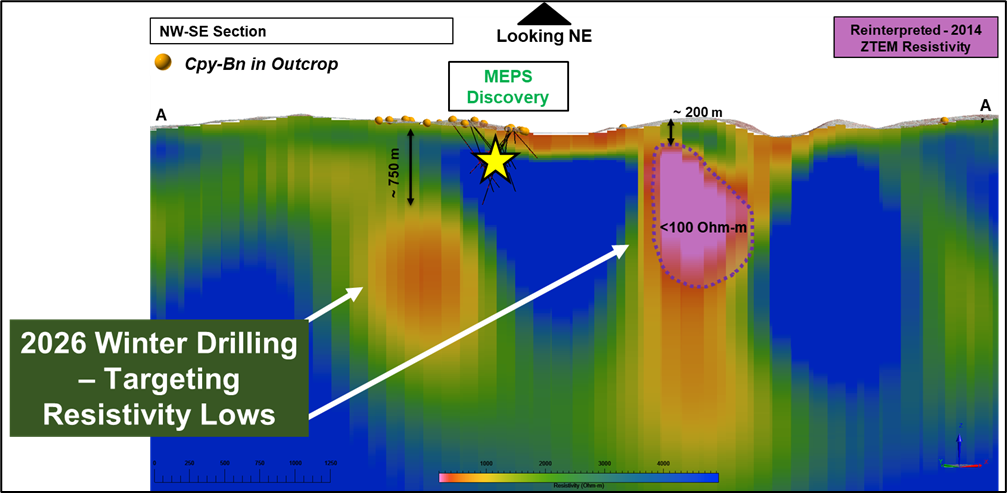 The 2026 drill program will focus on systematically delineating the scale of the MEPS Discovery area and evaluating additional targets generated from surface copper occurrences and geophysical data. Recent drilling has demonstrated a strong correlation between resistivity lows, favourable structural trends and copper mineralization which has been reinforced through physical property testing in drill core. The relative scale of the resistivity low associated with the MEPS Discovery and the resistivity lows associated with 2026 targets shows potential for a much larger system than what was delineated in 2025.
