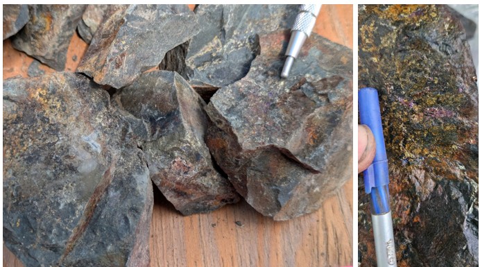 Outcrop samples SCFS-25-41 and SCFS-25-62 demonstrating bornite and chalcopyrite in mafic volcanics. Drilling to date suggests bornite is primarily present in mafic volcanics when in proximity to pre-mineral porphyry rocks. Samples have been shipped to the lab and assays are pending.