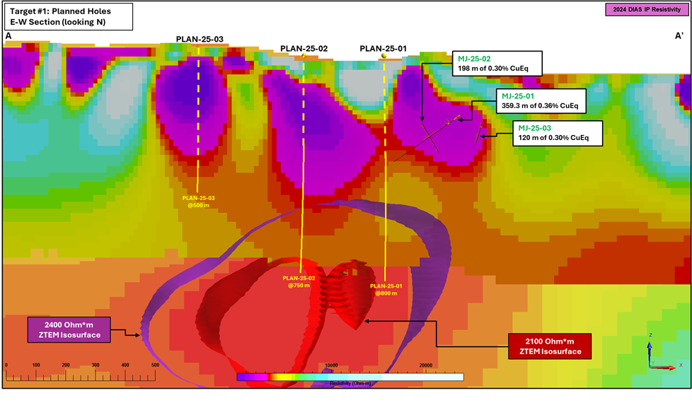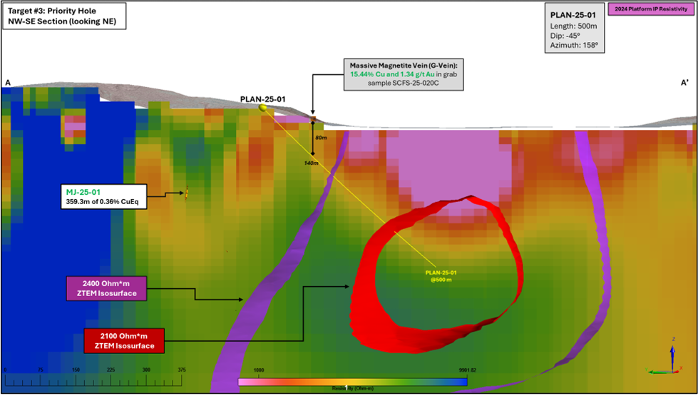 Planned hole targets below a massive magnetite vein, below the lowest resistivity anomaly from the DIAS IP survey and the surface expression and lowest resistivity body of the 2015 ZTEM survey. Note Plan 25-01 on this image is 25-05 in Figure 1.