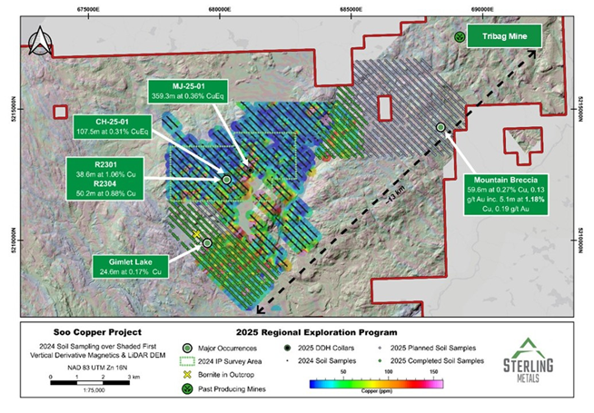 TORONTO, ON / ACCESS Newswire / August 7, 2025 / Sterling Metals Corp. (TSXV:SAG)(OTCQB:SAGGF) (“Sterling” or the “Company“) is pleased to announce the commencement of its Phase 2 drill program at it’s 100%-owned Soo Copper Project (“Soo Copper” or the “Project“) located in Batchewana Bay, Ontario. Since completing its Phase 1 drill program, the Company has been advancing its Phase 2 plan by re-logging historical drill core, reinterpreting geophysical data, and conducting further analysis of the 2-kilometre (km) x 1km area of interest. These efforts aim to identify new near surface mineralization and trace the down dip extensions of the GFP porphyry dyke swarms discovered during the initial drill program. Concurrently, the Company has expanded its soil sampling and prospecting program to further define new targets across the 30km-wide copper mineralized system. Highlights from this targeting and expansion work is listed below.