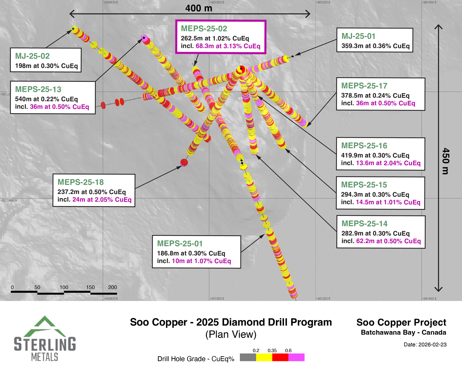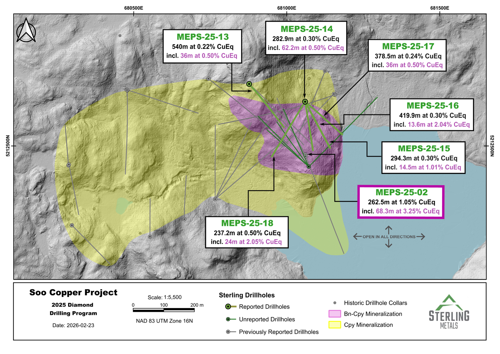 TORONTO, ON / ACCESS Newswire / February 27, 2026 / Sterling Metals Corp. (TSXV:SAG)(OTCQB:SAGGF) (“Sterling” or the “Company”) is pleased to report additional assay results from its expanded and completed 2025 drilling program at the Soo Copper Project (“Soo Copper” or the “Project”) located near Batchewana Bay, Ontario. Results from 6 additional drill holes continue to expand the copper mineralized footprint, while further defining and extending the high-grade bornite zone. Assays remain pending for the final 5 holes drilled within the core of the MEPS discovery area.