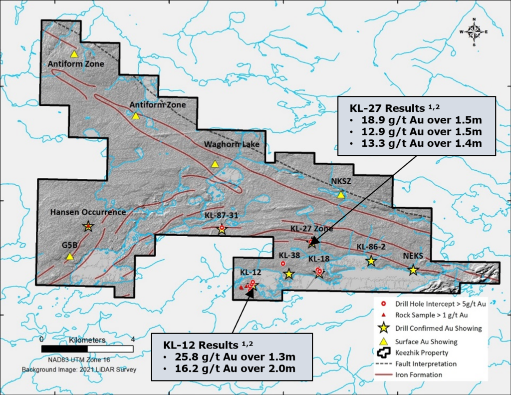 Eight drill-confirmed gold showings have been identified on the property (see Figure 1). The exploration strategy at Keezhik will utilize a dual approach.