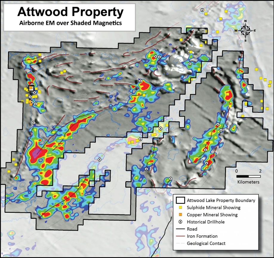 The goal at Attwood for 2026 is to resolve targets for drill testing in 2027. Work this year will include a property-wide airborne electromagnetic survey as well as geological mapping, prospecting and sampling.