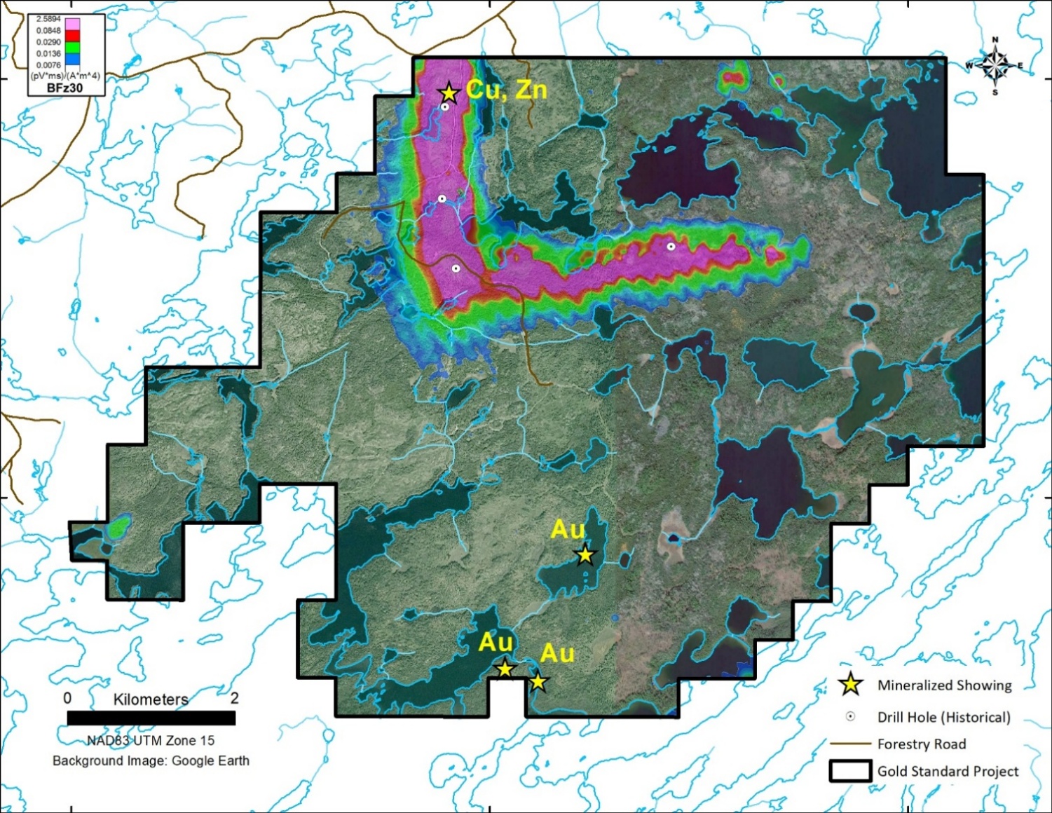 The property covers 22,230 hectares of geology that is prospective for precious metals and critical minerals including gold and copper. The area has not been explored since 1972 despite the presence of several untested conductivity anomalies and numerous showings of sulphide minerals, including arsenopyrite in banded iron formation, which is often associated with gold mineralization.