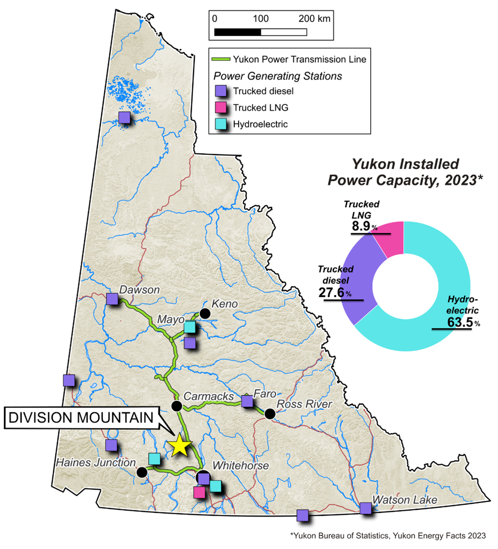 The Division Mountain deposit is located 20 km west of a major electrical transmission line that runs in parallel with the Klondike Highway and ideally situated to provide feedstock to a local power plant.
