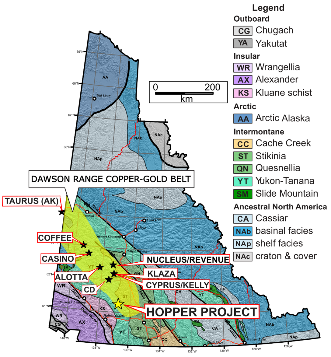 The Hopper Project hosts copper-gold skarn and porphyry mineralization. It lies within the southern part of the Dawson Range Copper-Gold Belt, a metallogenic province in west-central Yukon that hosts several major deposits, including Western Copper and Gold Corporation’s Casino porphyry copper-gold deposit, located 190 km to the north-northwest (Figure 1). The property covers a 74 km2 area and is accessible via a network of roads and trails. Mineral occurrences on the property, which collectively make up the Copper Castle skarn target and the Hopkins North porphyry target, are associated with a 4 by 6 km intrusion referred to as the Hopper Pluton. Dating of the pluton has yielded a late Cretaceous age that is consistent with most mineralization along the belt, including the Casino deposit.
