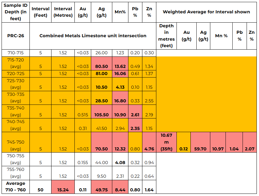 • 35 feet (10.7 metres) at 59.7 g/t Silver (Ag), 0.12 g/t Gold (Au), 10.97% Manganese (Mn), 1.04% Lead (Pb), and 2.07% Zinc (Zn).