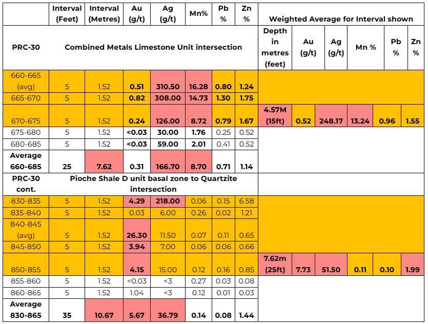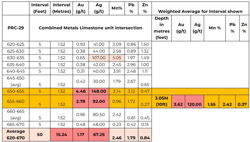 • including 10 feet (3.05 metres) at 120.00 g/t Ag, 3.62 g/t Au, 1.55% Mn, and 2.42% Pb.