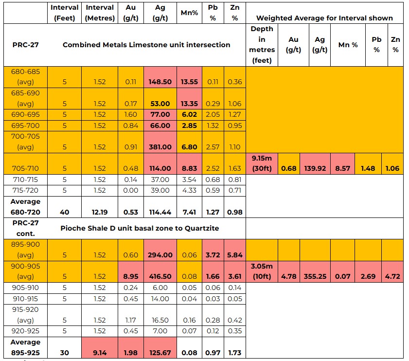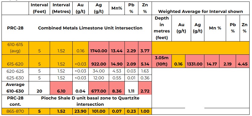 • including 15 feet (4.57 metres) at 248.17 g/t Ag, 0.52 g/t Au, 13.24% Mn, 0.96 % Pb and 1.55% Zn; and