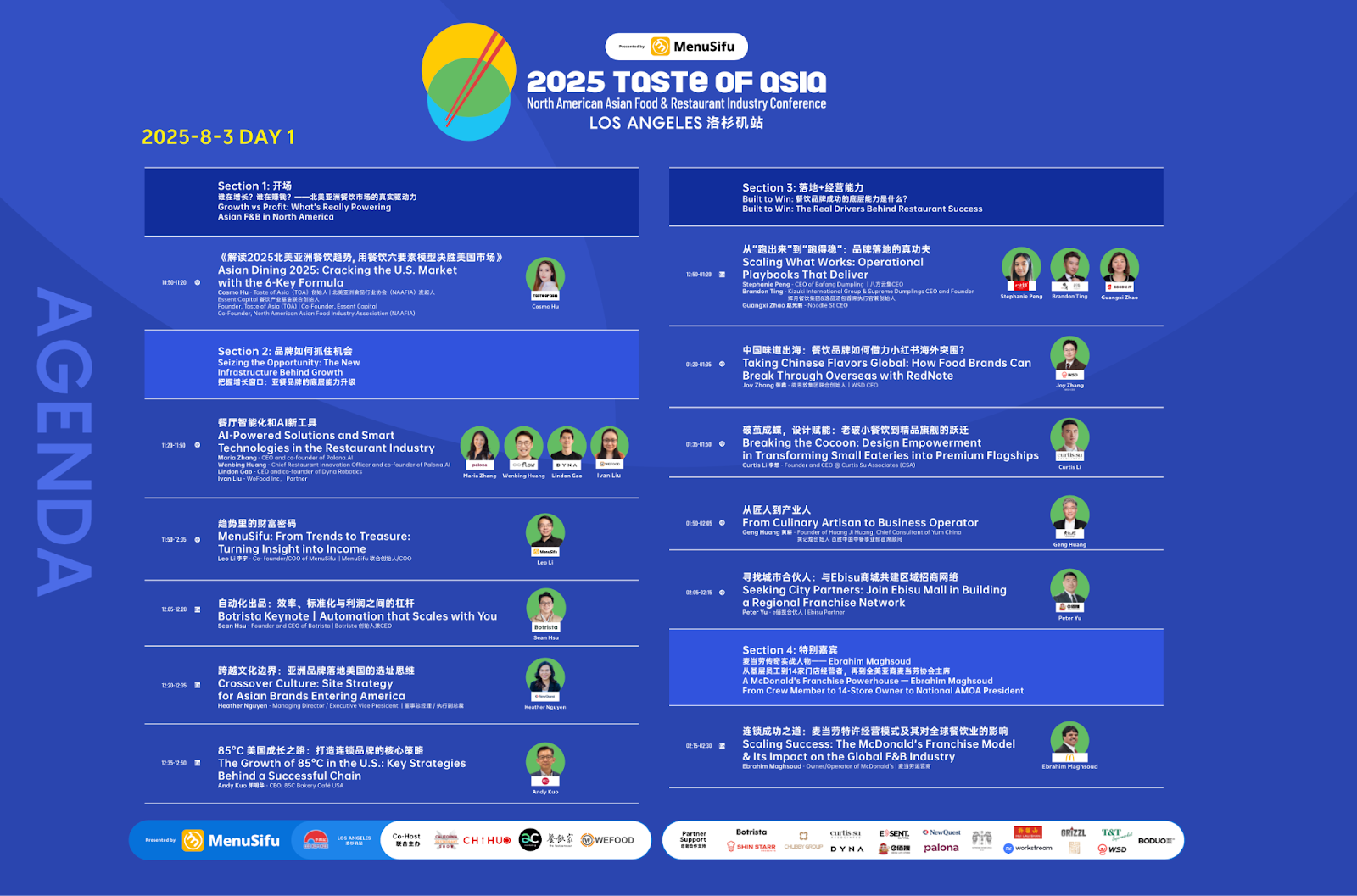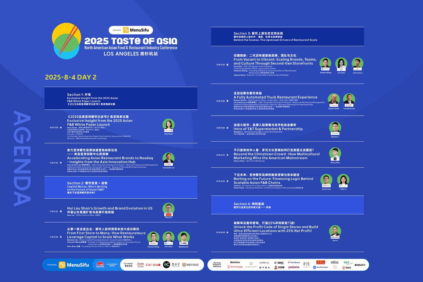 Over two days, attendees will hear from executives and founders on how automation and intelligent operations are redefining the financial model of Asian restaurants; how chain design and brand identity can scale cultural authenticity; and how cross-border investment and supply chain partnerships are being structured in a more dynamic, post-pandemic business environment. One of the highlights of the summit will be the release of the 2025 North America Asian F&B White Paper, offering insights into market dynamics, consumer trends, and emerging business models.