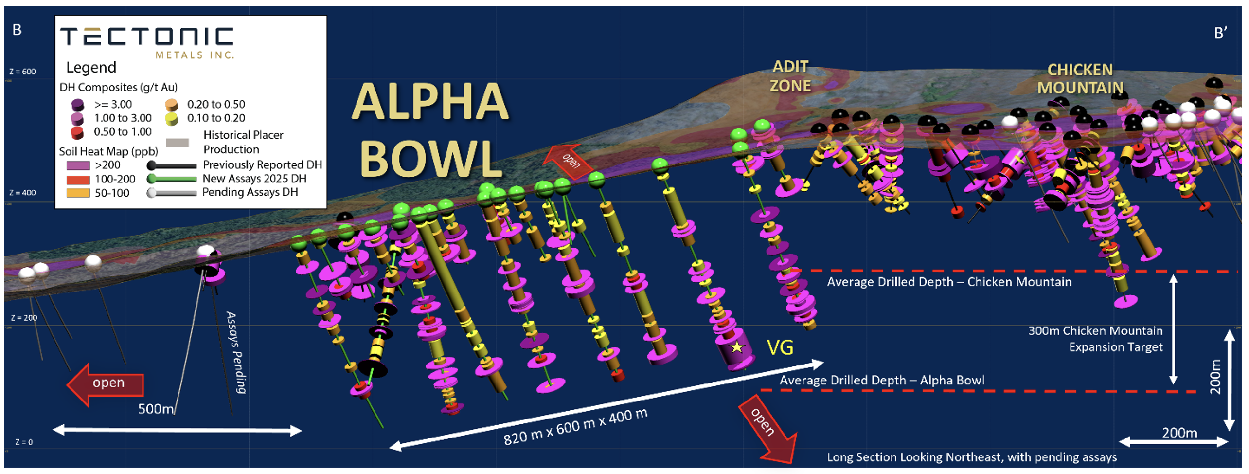 Figure 4: Long Section looking Northeast of Alpha Bowl, drill results and pending drill hole assays can be viewed at: https://www.tectonicmetals.com/_resources/news/nr-20260115-Figure4-with-title.png