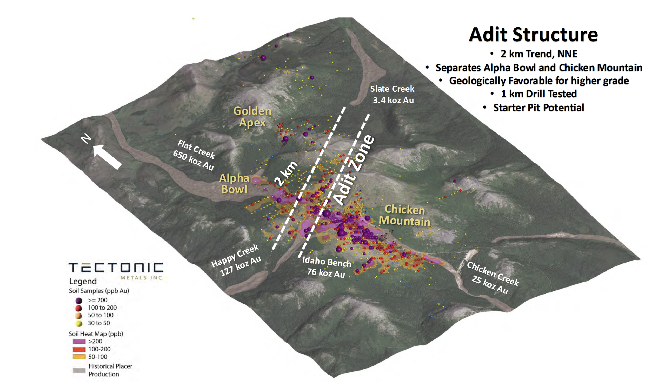 Figure 1: Oblique view of the Adit Structure relative to Alpha Bowl, Chicken Mountain, Golden Apex, the Placer Gold Production 1 , and the gold-in-soil anomalous areas: https://www.tectonicmetals.com/_resources/news/nr-20251222-Figure1.png