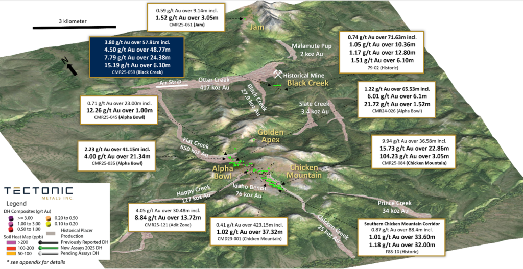 Tectonic drill hole CMR25-059 returned 4.50 g/t Au over 48.77 metres (“m”), including a high-grade core of 7.79 g/t Au over 24.38 m with 15.19 g/t Au over 6.10 m, starting from surface . At present the intercepts are reported as downhole lengths, as insufficient data exists to determine true widths. Mineralization occurs as quartz veinlets and stringers hosted in hornfelsed, oxidized silltstones and intermediate dykes along the eastern contact of the Black Creek. This represents Tectonic’s first-ever drilling at Black Creek and marks the first drilling in the area since 2003, confirming a significant new gold zone that expands the known footprint of Flat’s reduced intrusion-related gold system (“RIRGS”).