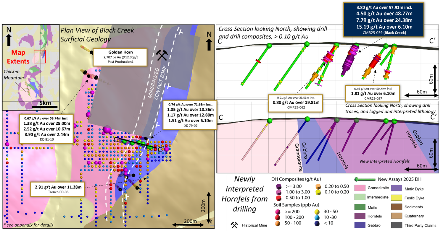 Our first pass drilling at Black Creek is transformative for several reasons. Hole CMR25-059 returned 4.50 g/t Au over 48.77 metres with 7.79 g/t Au over 24.38 metres beginning at surface, hosted in hornfelsed sediments along the intrusion margin. Importantly, this confirms high-grade gold in a fundamentally different host rock than the monzonite-dominant mineralization we have defined at Chicken Mountain and Alpha Bowl.