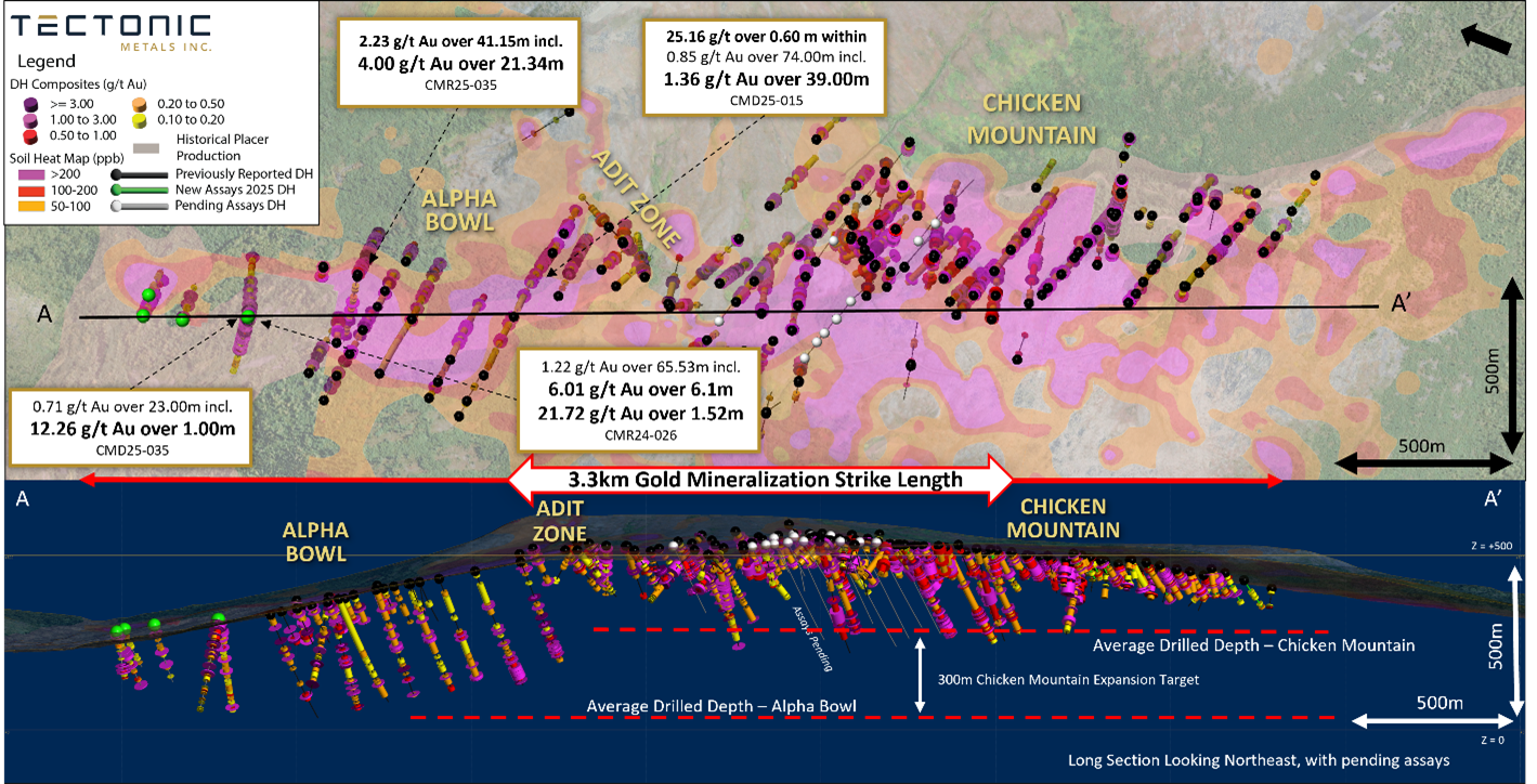 With multiple intrusion centers now demonstrating gold mineralization across varied geological settings, and with the Chicken Mountain-Alpha Bowl corridor extending to 3.3 kilometres of drilled strike, we are now starting to see the true potential of what the Flat Gold Project can deliver.”