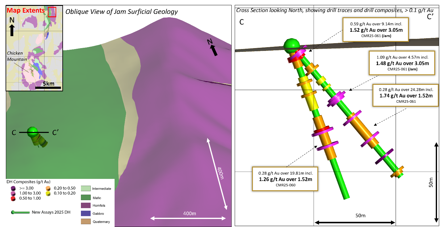 First-ever drilling at Jam target intersects multiple gold zones in volcanic rocks 10 kilometres north of Chicken Mountain