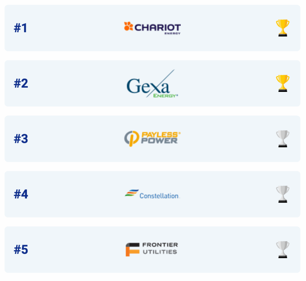 The 2025 “Best Texas Electricity Provider” is Chariot Energy. Still a relative newcomer to the Texas electricity market, this isn’t the first time Chariot Energy has ranked highly on our list of best providers. In these challenging financial times for many Texans right now, Chariot has had some of the consistently lowest rates we’ve seen in years. Normally, customers pay a premium for green energy. But every single plan from Chariot Energy is sourced from 100% renewable energy sources. So Chariot’s ability to offer low rates and environmentally friendly electricity plans is a pretty impressive achievement. Additionally, they scored great in Customer Communication and had strong Customer Reviews. All of these things have combined to propel Chariot to the #1 spot in our rankings for 2025.