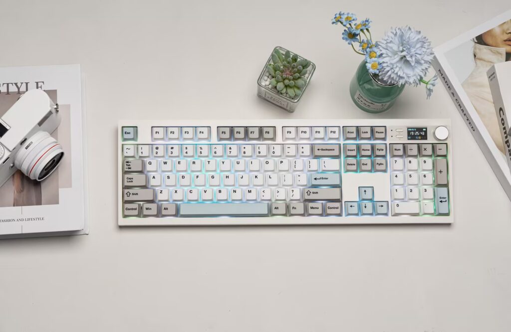 The easily accessible knob can be programmed to control various functions, from adjusting brightness to scrolling through playlists, checking the date, monitoring keyboard status, or even loading custom GIFs. The vibrant smart screen visualizes the device’s status and supports the upload of up to three custom animated images. Additionally, a new feature has been introduced: Typing Mode, which displays the character being typed in real-time on the screen, offering an interactive and dynamic typing experience.