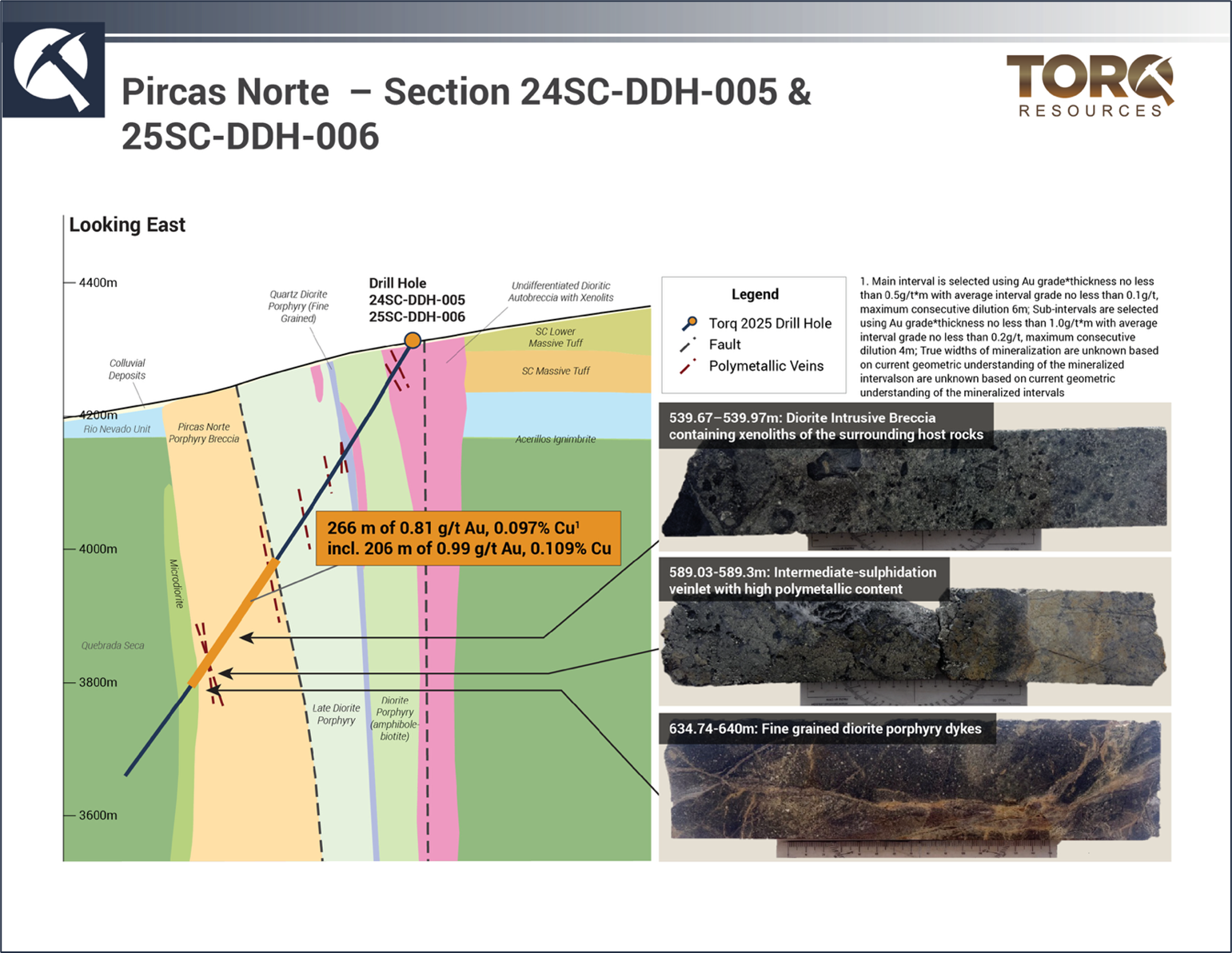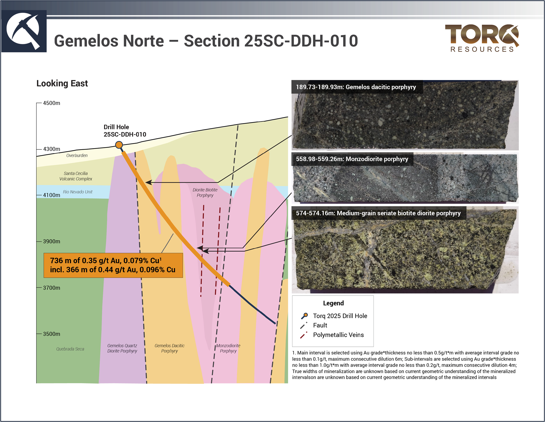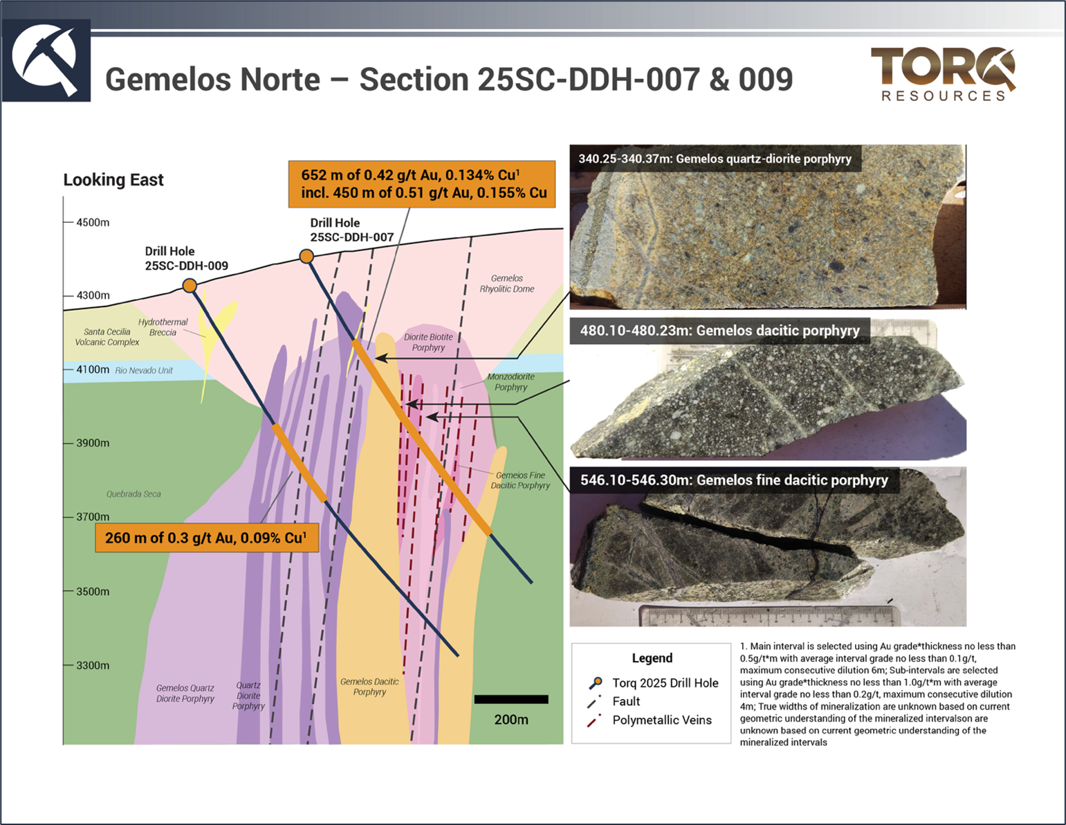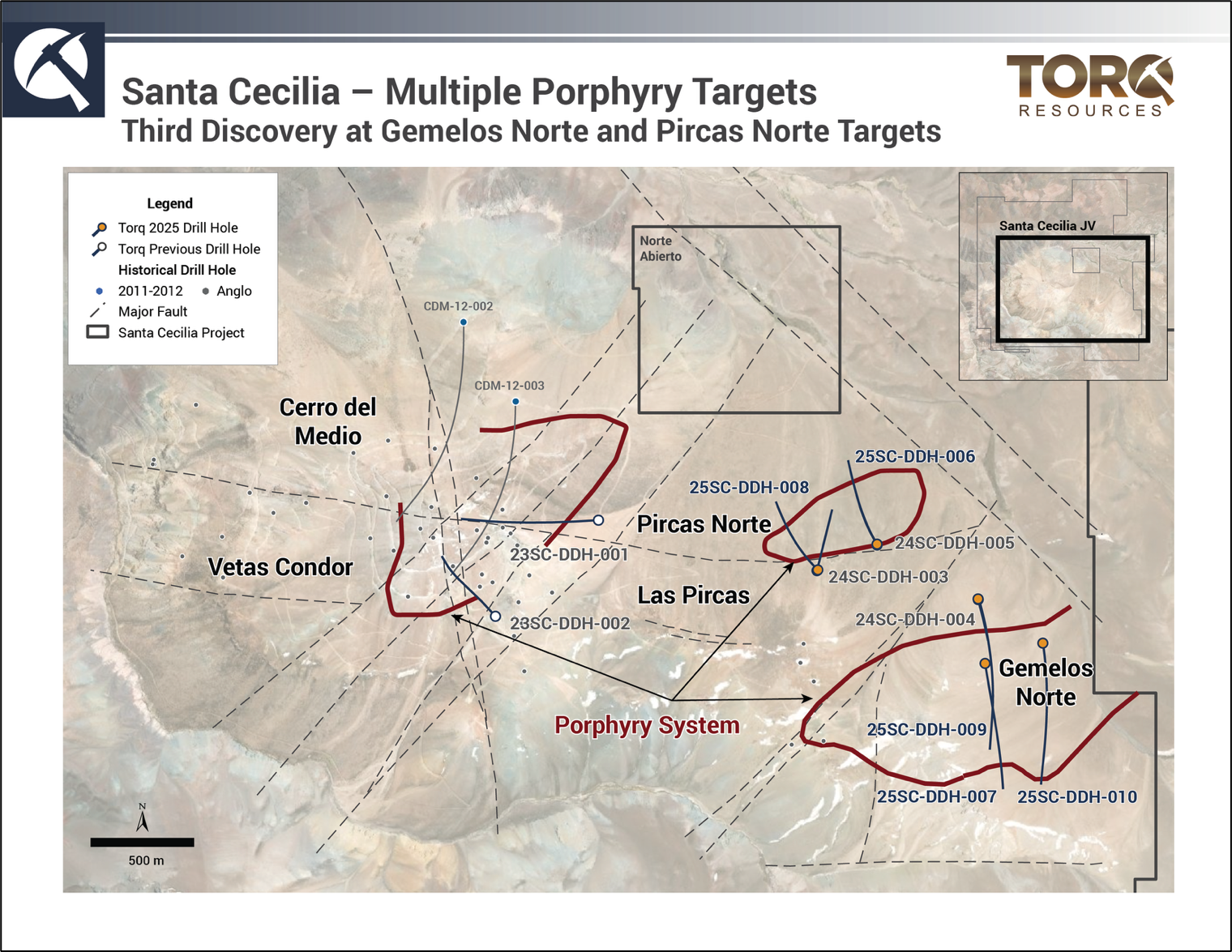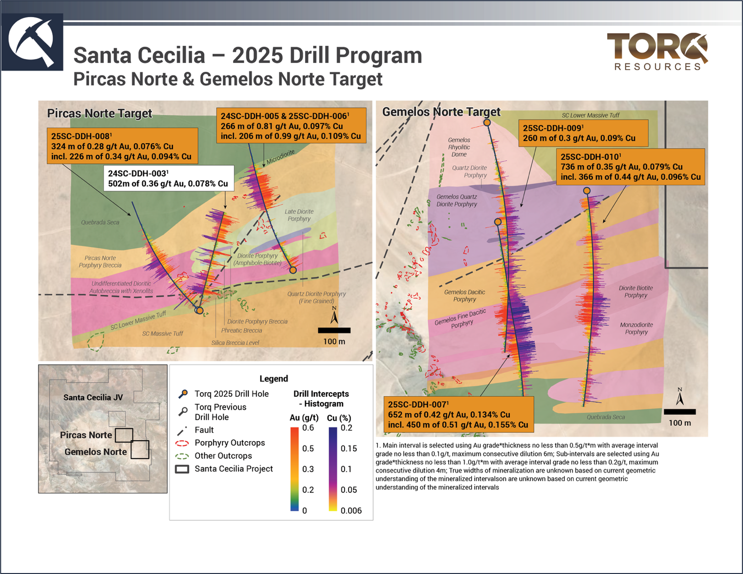 Shawn Wallace, CEO and Chair of Torq, states, “These results reinforce the scale of what we’re uncovering at Santa Cecilia. With Gemelos Norte now confirmed as our third discovery, we may be looking at a district-scale gold-copper system that remains wide open in multiple directions. The sheer size of these intercepts, combined with increasing grades, points to a project with significant potential. Our agreement with Gold Fields continues to validate this vision – their spend to-date of over $6 million of a possible US$48 million earn-in has already translated into a 10% vested interest, underscoring the confidence we share in the extraordinary opportunity this project represents.”