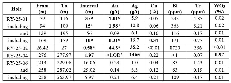 Hole RY-25-04 bottomed in 1.97 metres grading 1,465 g/t silver, 0.22% copper and 0.97% WO3. The hole was terminated short of target depth at 277.97 metres due to drilling difficulties in what appears to be a fault, so the full width of this mineralized zone is not known. Lead, tellurium and antimony values in this interval were at background levels, suggesting the presence of native silver. The intersection is located 640 metres from three historically known polymetallic veins, discovered in the 1950s, and is inferred to be the direct extension of one of these veins (Figure 1).