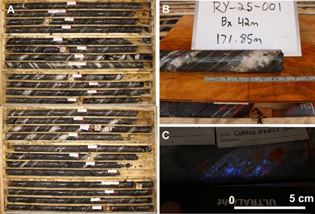 Hole RY-25-01 was collared approximately 400 m from mapped extent of the Itsi Pluton, within hornfelsed Road River Formation siliciclastics. The hole targeted an area of intense sheeted veining in outcrop where specimen samples of individual, one to five centimetre wide, quartz-arsenopyrite veins have yielded up to 6.5 g/t gold and 1565 ppm bismuth. Hole RY-25-01 cut a 224 m wide zone (from surface) of hornfels hosting an abundance of sheeted quartz-pyrrhotite-chalcopyrite±arsenopyrite±scheelite veins, with measured vein densities greater than 25 per metre (Figure 2).