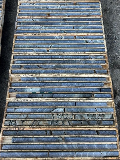 Hole RY-25-02 was collared 360 m southwest of RY-25-01, adjacent to the mapped extent of the Itsi Pluton. The hole intersected hornfelsed siliciclastics, as well as intervals of granodiorite, commonly exhibiting a chlorite-rich greisen type of alteration. Sheeted vein density was significantly lower than the first hole, comprising only minor quartz-sulphide veins in the hornfels and incipient tourmaline-muscovite veins in the granodiorite.